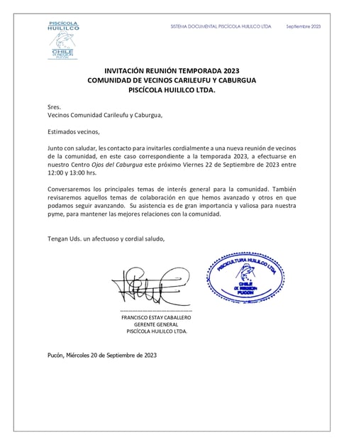 El día 22 de Septiembre de 2023, se efectuó 5ta. Reunión Anual con vecinos de la comunidad de Carileufu. Se proyectó una presentación en formato Power Point con una retrospectiva de las actividades de colaboración efectuadas durante los últimos años, y se discutió sobre distintas problemáticas actuales. Se aprovecho también de recorrer las instalaciones y especialmente mostrar a nuestros vecinos la implementación de nuestro sistema de generación de energía fotovoltaica que pudimos implementar en nuestro plantel con el cofinanciamiento de un proyecto regional para pymes de la Araucanía que nos adjudicamos a final de 2022.