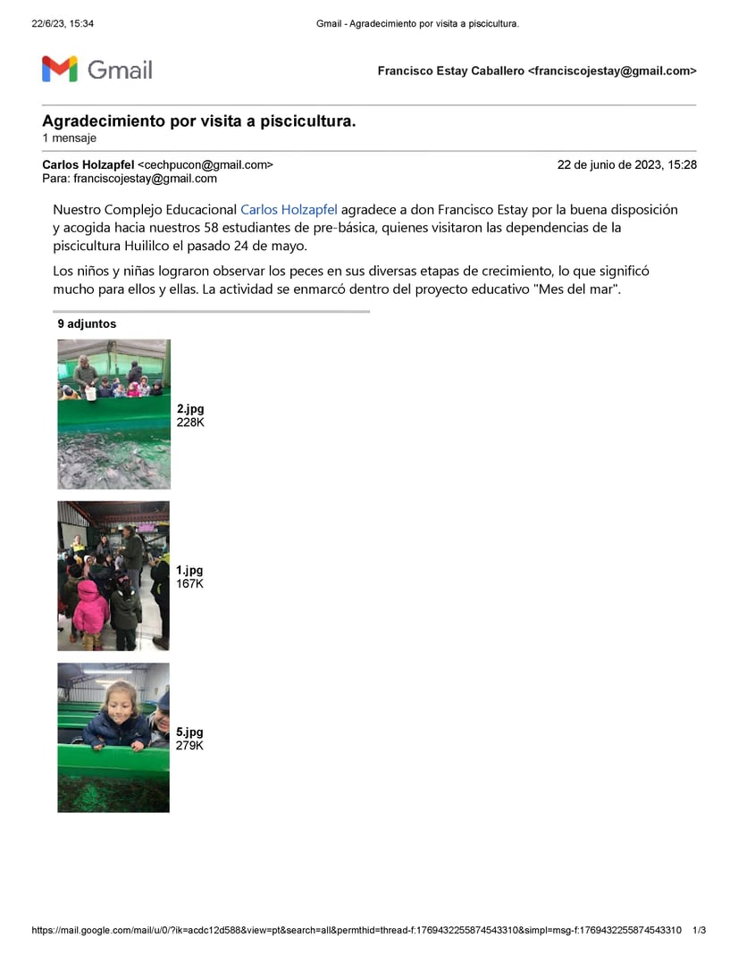 Durante el día miércoles 24 de Mayo de 2023, nuestro Centro Ojos del Caburgua recibió la visita de 58 pequeños alumnos de Pre-Básica del Colegio Carlos Holzapfel de Pucón, junto con algunos de sus apoderados y educadoras, como una actividad enmarcada en la celebración del Mes del Mar. La actividad se desarrolló con gran interés y alegría de estos pequeños futuros piscicultores.