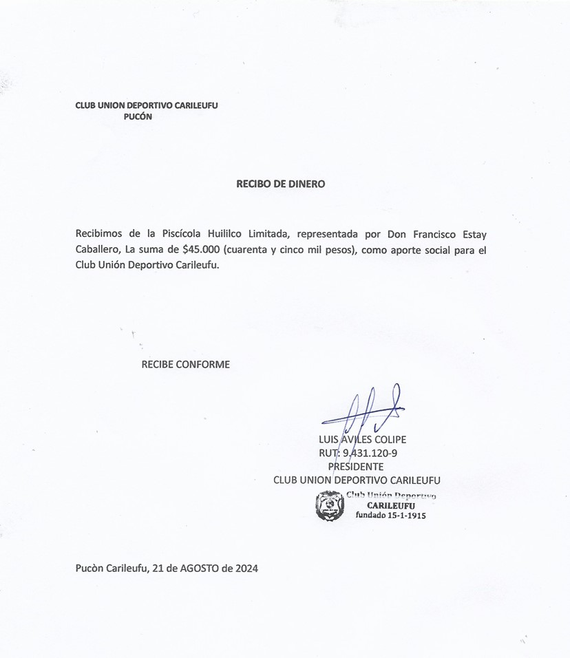 Con fecha domingo 15 de septiembre de 2024 Piscícola Huililco Ltda. concreto nuevamente la donación de un set de 18 camisetas y sus correspondientes shorts de futbol al Club Unión Deportivo Carileufu, en este caso para el equipo de primera. Recibió la donación el capitán del equipo Felipe Ortega.