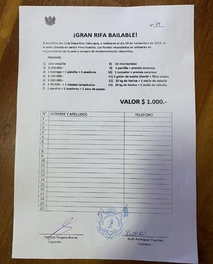 Rifa del Club Deportivo Caburgua, programada para el 30 de Noviembre de 2024. El horno corresponde al premio N° 8.