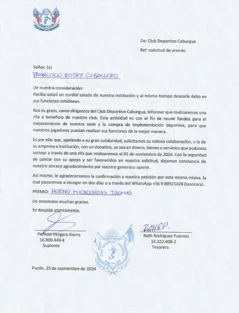 Carta solicitud de donación de premio del Club Deportivo Caburgua