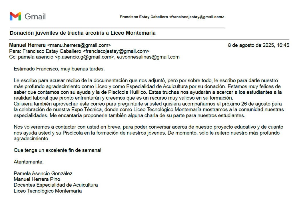 El día 08 de agosto de 2025, se efectuó una donación de 1.000 alevines de trucha arco iris para al Liceo Tecnológico Monte María, con el fin apoyar las actividades de docencia de dicho establecimiento en su formación de estudiantes en la Especialidad en Acuicultura.