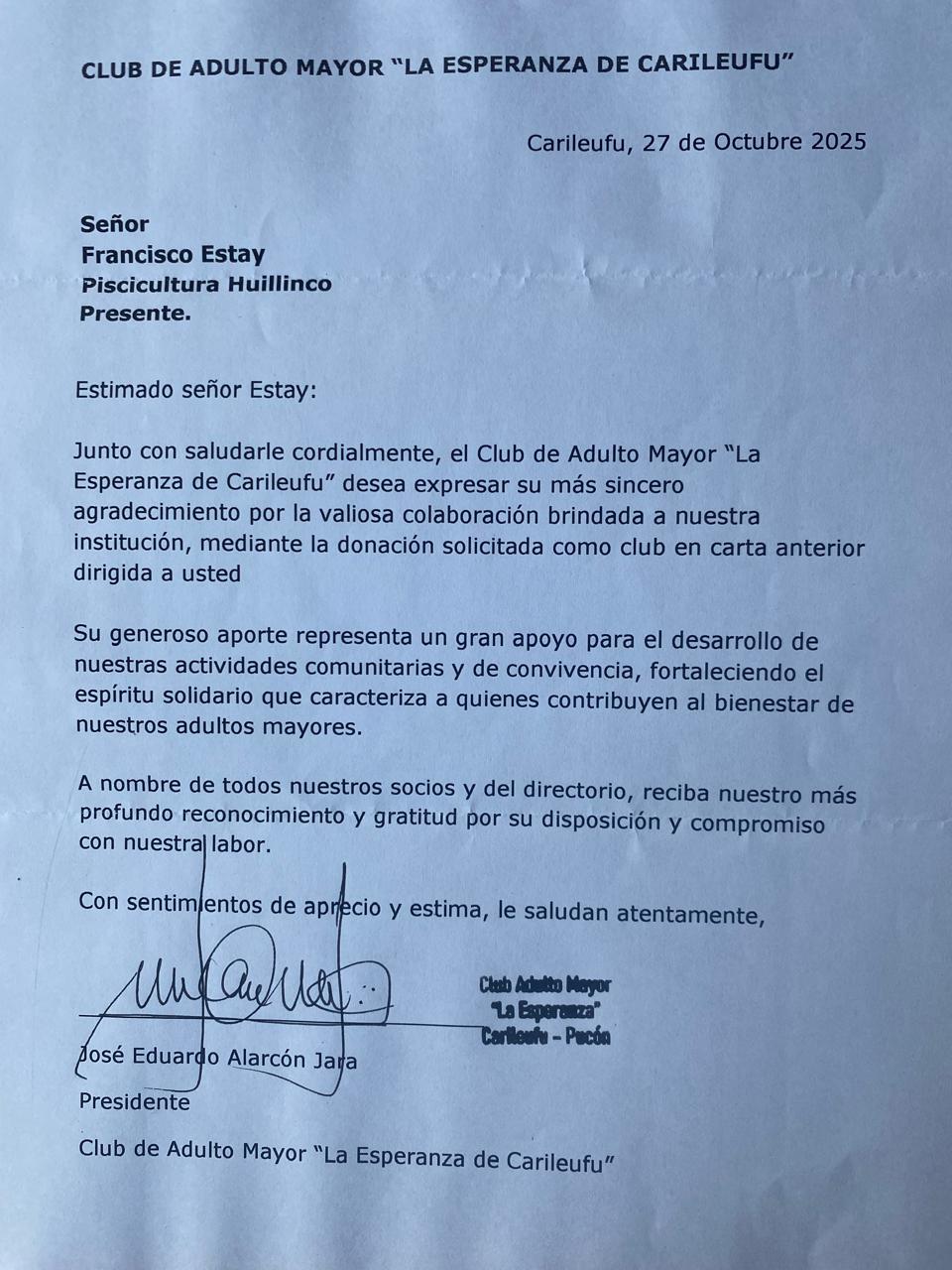 El día lunes 27 de octubre de 2025, se hizo entrega de una mesa plegable y un juego de loza al Club de adultos mayores de Carileufu.